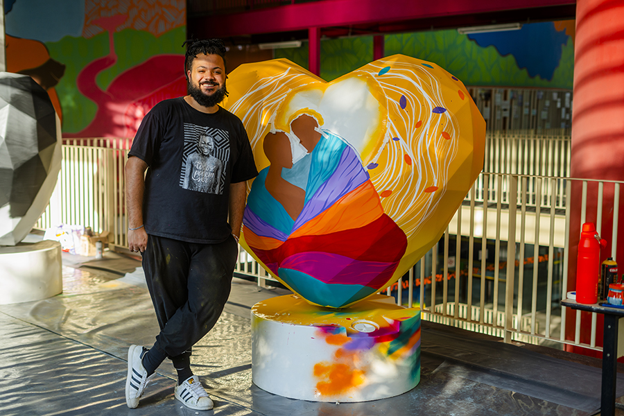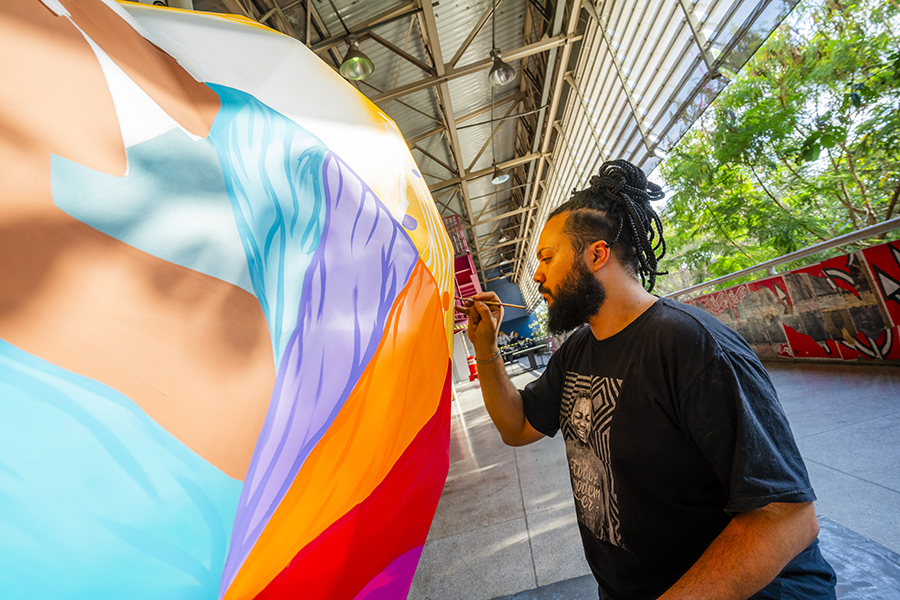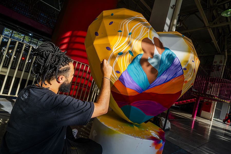 In his work, he develops a story of black protagonism alongside characters that are reinterpreted as Baobá trees. His connection with afro culture became even stronger after creating a social project with kids using ludic painting, which took place in Mozambique.