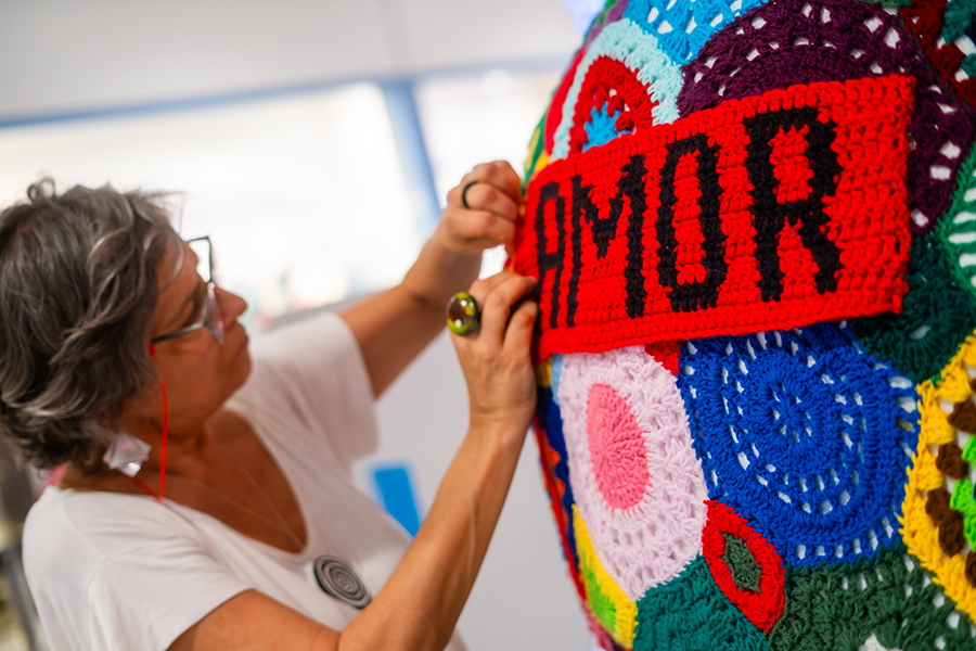 no movimento Yarn Bombing, bombardeio de fios, desde 2015 convidam os participantes dos encontros e oficinas a repensarem os espaços, relações de pertencimento e saberes tradicionais através do fazer e tecer manual. Mais de 6 mil pessoas já conheceram e aprenderam técnicas como crochê, bordado, tricô, tear e macramê em suas ações presenciais.