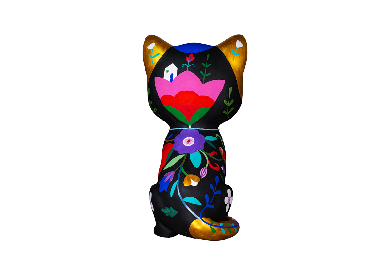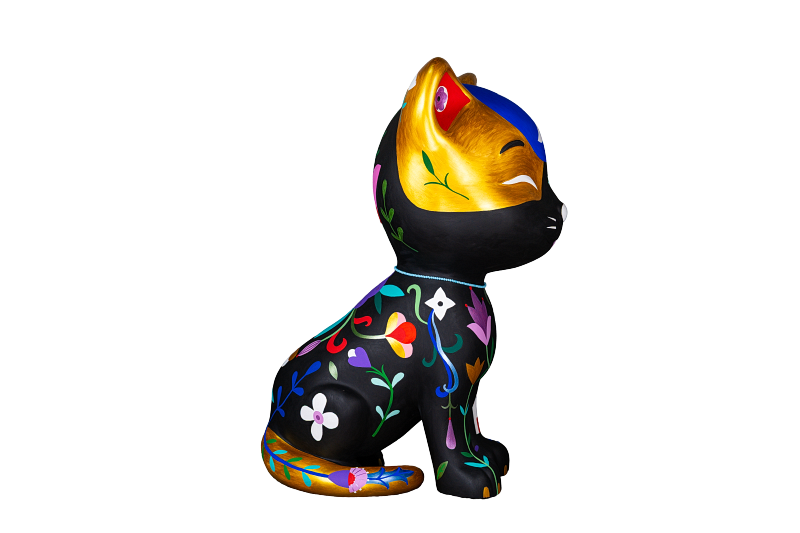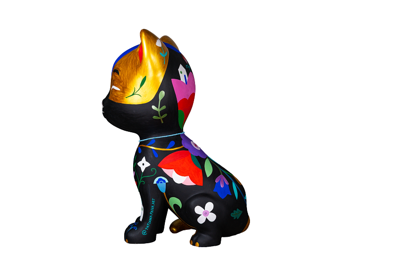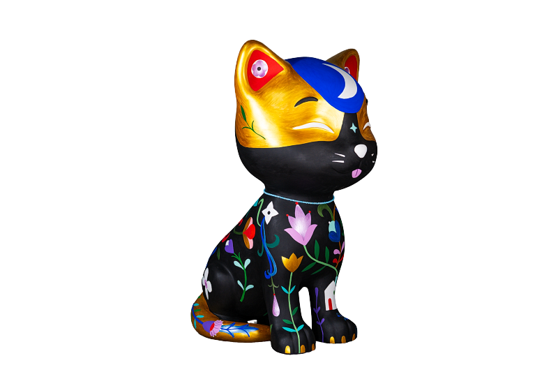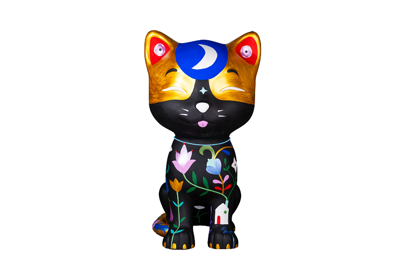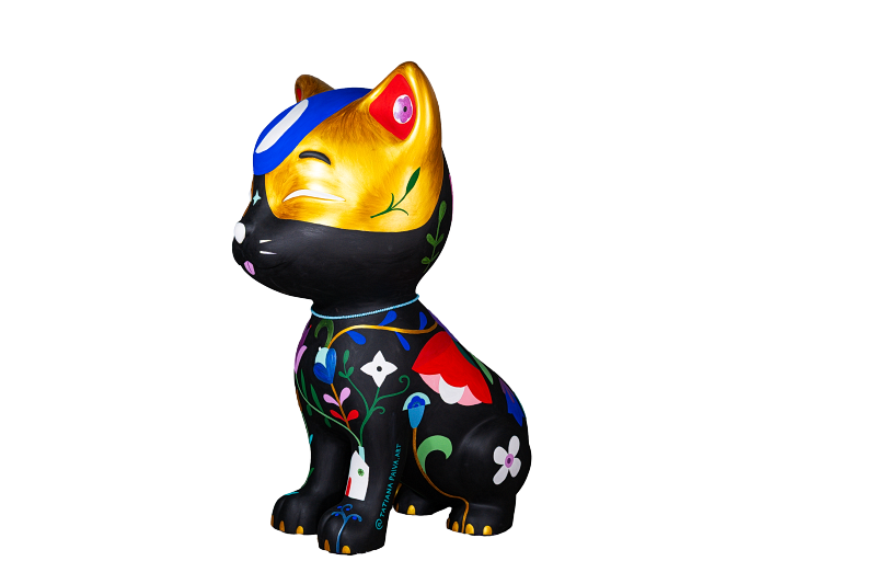 * Contraste dia e noite: O preto predominante representa a vida noturna dos felinos, enquanto o dourado simboliza o dia. Juntos, criam um charmoso gato malhado, com elementos como a lua, estrelas e sol reforçando essa dualidade.